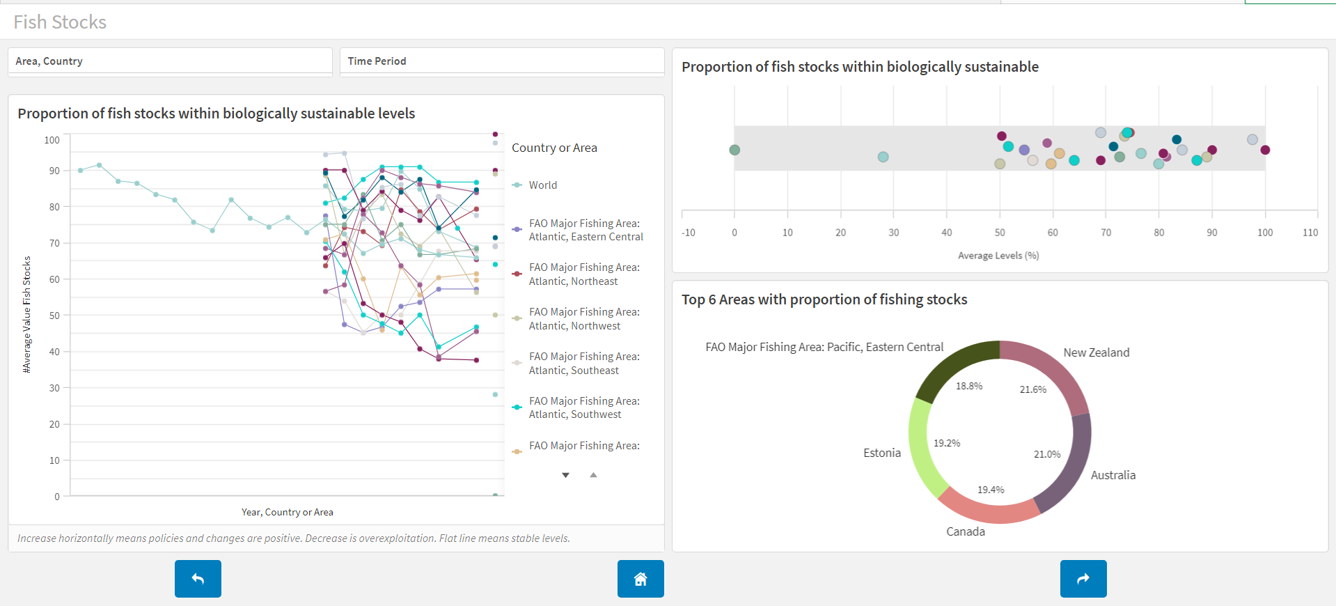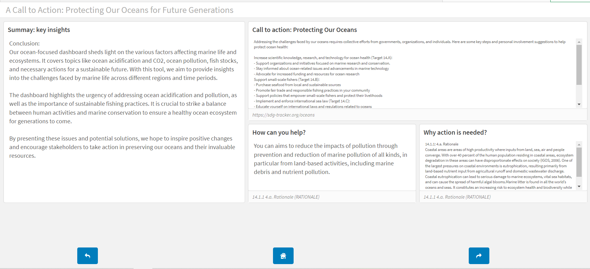 Het doel van het dashboard was om de belangrijkste problemen in verband met SDG 14 te communiceren en de gebruikers aan te sporen tot actie. De hoofdpunten op het dashboard waren gebaseerd op de volgende categorieën: oceanenverzuring, vervuiling (CO2-uitstoot), visvoorraden en een oproep tot actie.